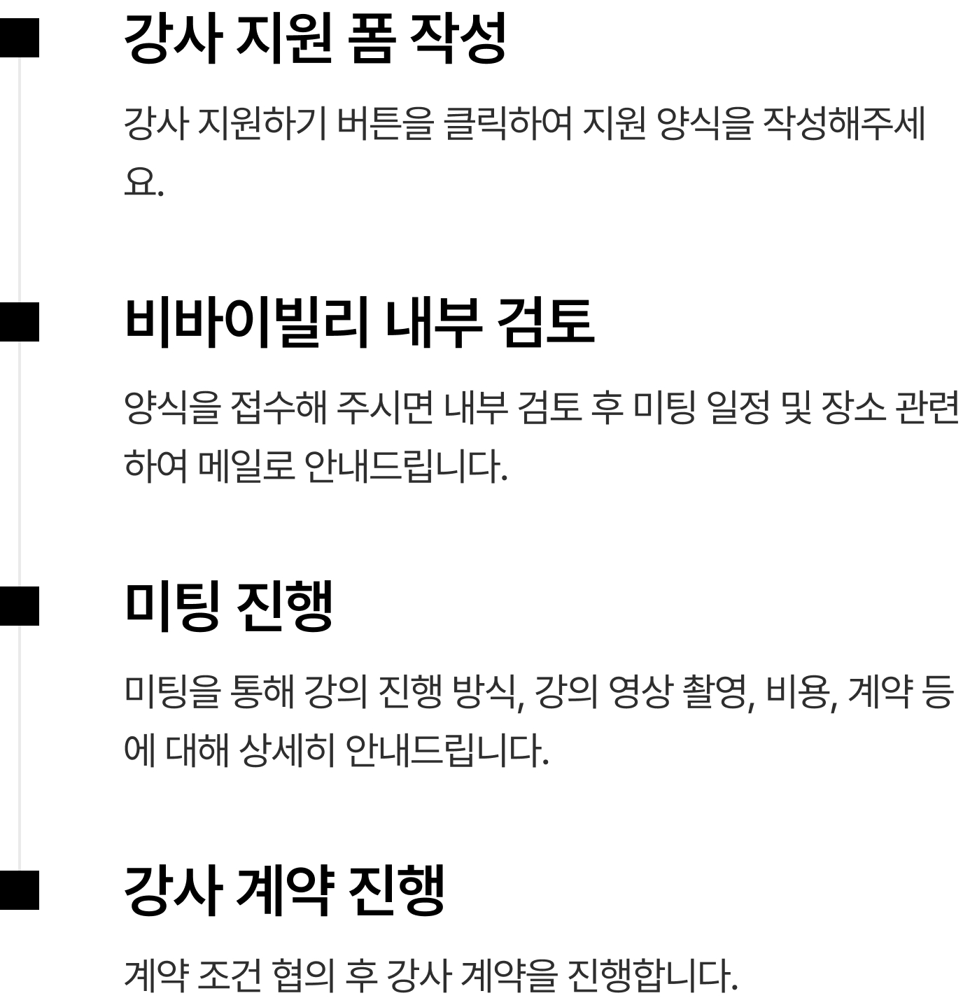 미팅을 통해 강의 진행 방식, 강의 영상 촬영, 비용, 계약 등에 대해 상세히 안내드립니다.